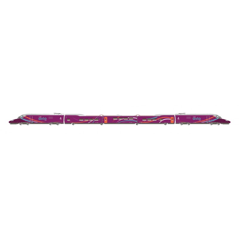 RENFE, juego básico de 5 piezas del tren de alta velocidad "AVLO", color morado, Época VI con decodificador DCC. AVLO, abreviatura de Alta Velocidad Low Cost, es una marca de la compañía ferroviaria española Renfe para servicios ferroviarios de alta velocidad asequibles. El concepto, inspirado en la marca Ouigo de la SNCF, se lanzó en junio de 2021 en la ruta Madrid-Barcelona. (Fuente: Wikipedia)