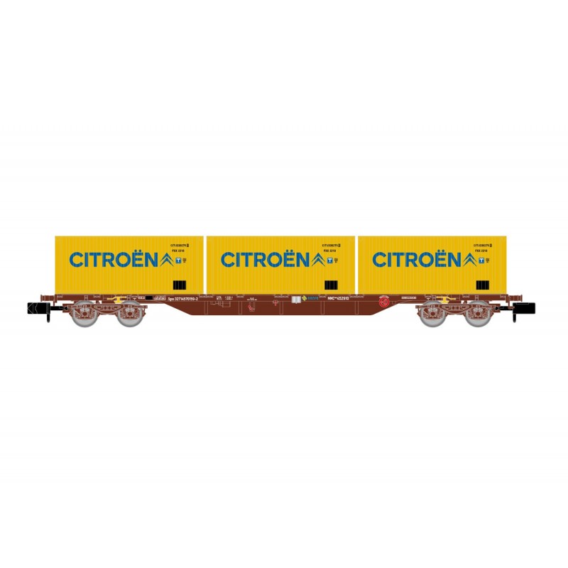RENFE, vagón porta contenedores de 4 ejes MMC3, decoración azul, cargado con 3 contenedores de 20' Citroën
